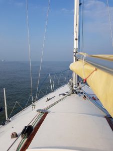 Conditions were mainly light, and misty, very, very misty! We could see the shoreline at start time and we had a good view of Cowes near the finishline. Other than that we spent six hours racing in a km radius circle fringed by fog and ghost ships. The GPS was invaluable for working out where to go. We would have been lost without it.